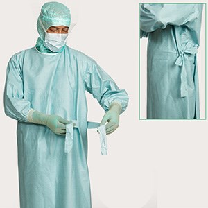 1. Grasp the sterile gown and step into an area where the gown may be opened without risk of contamination. Put both hands into armholes. Hold the gown away from the body, and allow it to unfold completely.